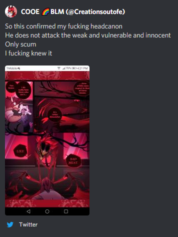 Of-fricken-course, she thinks Alastor is defending her. Oh yes, he's "defending" the weak, that's why he let those birds kill that innocent shopkeeper in the beginning of the comic. Buttons, get that p*ss-soaked head out yer butt. Alastor is a manipulative sh*thead