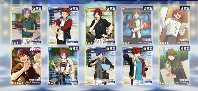 プレアデス待てなくて七夕衣装と引き換えに回したら10連できてくれた、、😭ありがとう😭😭 桃李単発で出したから追いかけてきた!さすが執事さんだね〜!!(?) ちなみにfineの2推しくんです、、、😄 まあたつぱも狙ってた千秋も来てないんですけど?