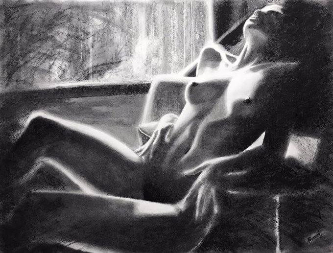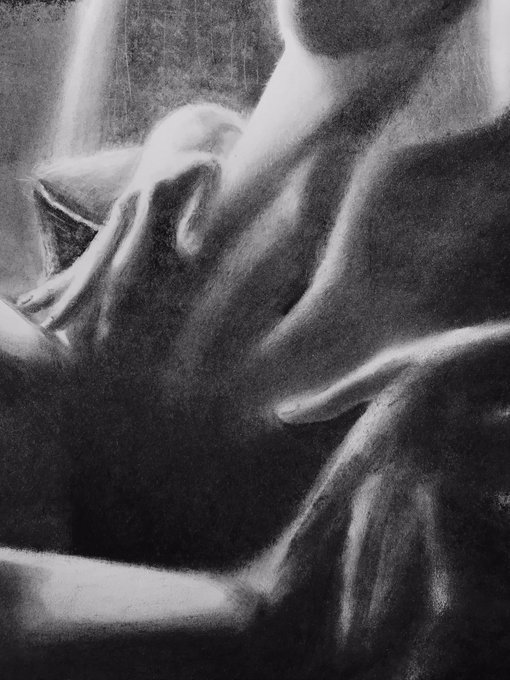 Here’s my charcoal figure drawing complete. I added some fun little detail marks and backlit hairs. 18x24” #artist #ArtistOnTwitter #figurativeart #figuredrawing