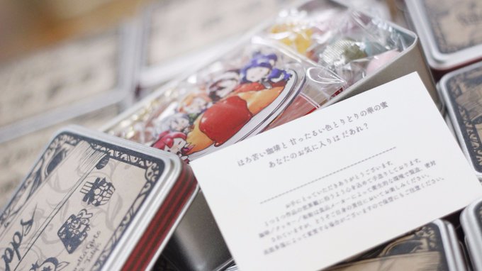新刊に付くセットが完成しました!大正ロマンということで、懐かし可愛いサテン柄のLiPPS缶ケースに、オムライスにむらがるちびLiPPSアクキー、大正喫茶風に珈琲とクッキーと和飴5種が入っています。作中でも周子と奏が飲んでますが、一緒にお茶してる気分で本を読めるセットです〜!