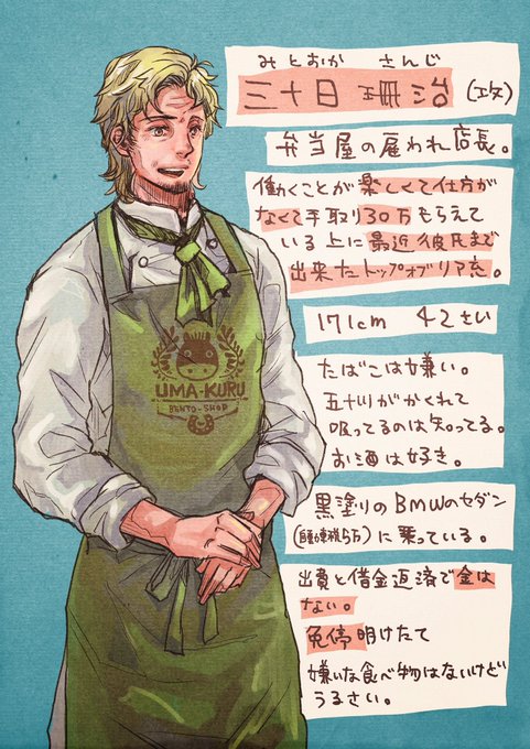 #30万50万BL #創作BL 自分が忘れるからキャラシート的なものを作った…。 現に五十川が喫煙者なの忘れてたし。もうタバコ辞めればいいのにな? うまクルのロゴを真面目に考えたい。