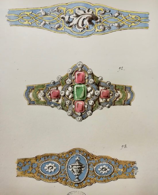 Quelques maquettes de bijoux dessinés par Louis Eugène Crouzet (1782-1862) parmi les 16 volumes de modèles de ses bijoux, créés dans les années 1860, que nous conservons.