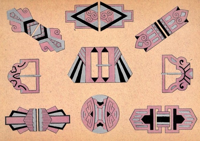 Ensemble de planches pour des accessoires de mode, de coiffure et des éléments décoratifs, conçues par l’atelier Paris fantaisie dans les années 1920-30