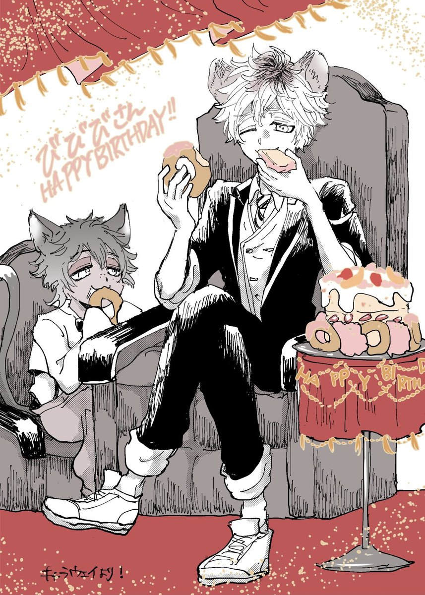 キャラウェイさん【 @ sunset_crwy 】にお誕生日プレゼントいただきました!!!!(掲載許可もいただきました!)たれ目ケモかわいい推しのビックバンドーナツ美味しいです…アァおくち…😭😭いっぱい食べて…😭HAPPY…🎂