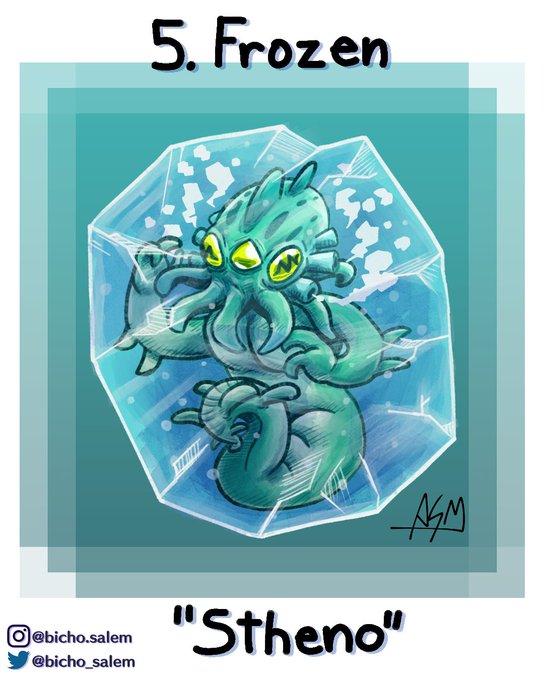 Day 5: Frozen. An obviously Lovecraftian creature, she became trapped in an iceberg. Even while dormant, she blasts her surroundings with psychic waves. Named after the eldest gorgon sister.