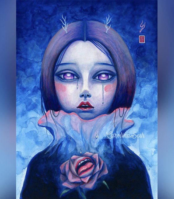 Are you feeling blue? 💙 I Will Drink Your Sweet Tears💧for @darkartemporium’s Melancholia show (sold) #artshow #darkart #darksurrealism #popsurrrealism