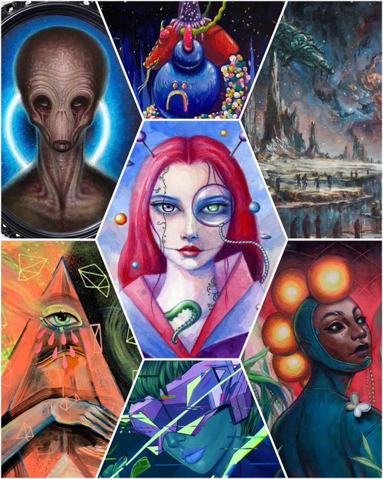 ONLINE NOW!! 2121: A FUTURE ODYSSEY 🛸🤖🔮 Full collection at https://t.co/cVamsnI6Eo. 20+ artists’ interpretations of possible futures. What do you think the future has in store for us? https://t.co/YC9PsnTJ9n 💙 #artshow #scifiart #popsurrealism @Gristletattoo