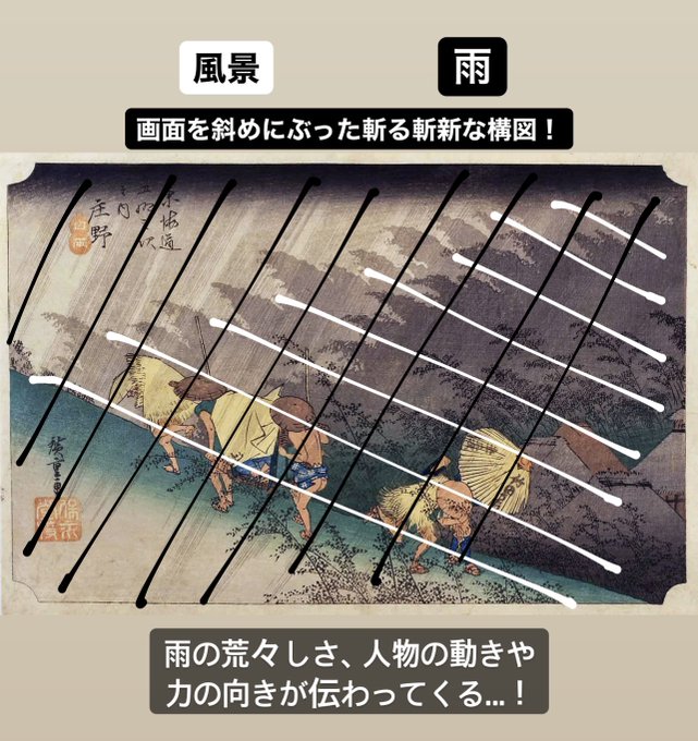 雨の浮世絵の傑作といえば歌川広重《東海道五拾三次之内庄野白雨》