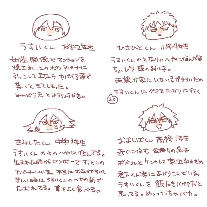 ※年齢操作 色々あってボロアパートに引っ越して来た臼井くんが、同じアパートの住人達に迷惑かけられる日々送ってほしい。 もう既に柴君はデキてるし、水樹が高校生ぐらいになったら水臼になる。グミのお返しめっちゃしてくれる。