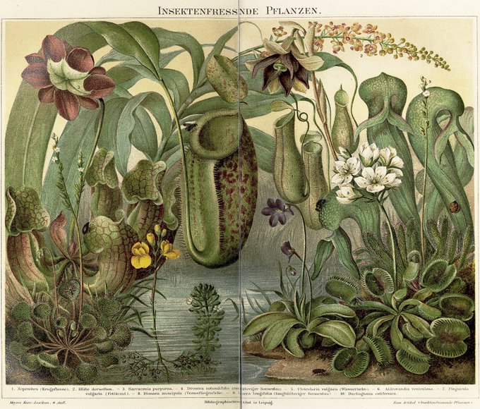 Carnivorous plants obtain nutrients from animals or protozoans, which they trap and digest. #SciArt of "insektenfressnde pflanzen" ("insectivorous plants") from "Meyers Konversations-Lexikon", v. 8 (1890, 4th ed.). In #BHLib from @uoftlibraries ➡️ https://t.co/KzkHjy2TbD
