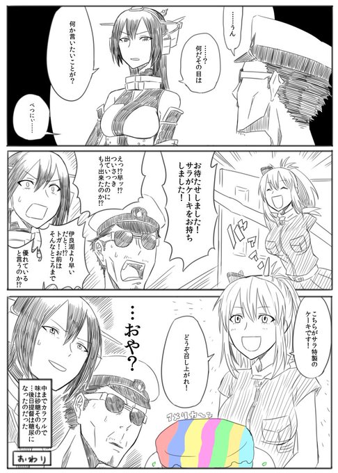 サラトガと長門と提督とケーキとアメリカの漫画