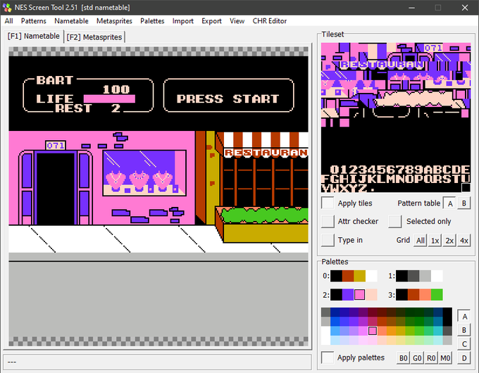 I've just made the changes to 8x16 sprite mode. Now with 4 enemies. When they're strategically positioned like this it doesn't flicker, but in regular gameplay it should be a flickerfest of sorts with 2 players and many enemies. Anyway, 8x16 mode is awesome. #nesdev