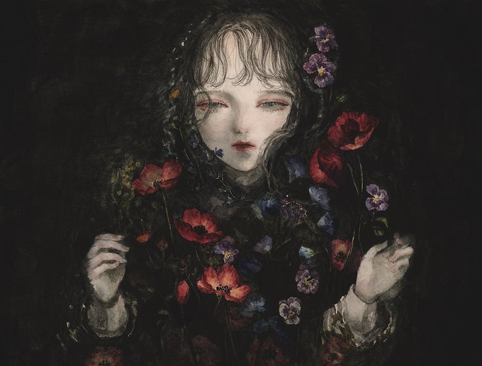 透明な感情をテーマに花や少女を描く。