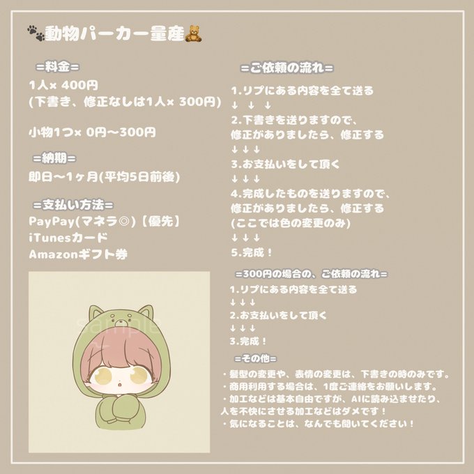 《🐾動物パーカー量産🧸》 1人×400円で、下書きなしだと1人×300円でご依頼受け付けています🙇♀️ ペア画にも出来ます🙆♀️ PayPayやアマギフなどで、お支払いできます! ご依頼、お待ちしています🙇♀️ #量産依頼 #ミニキャラ依頼 #ちびキャラ依頼 #イラスト依頼 #アイコン依頼 #ペア画依頼