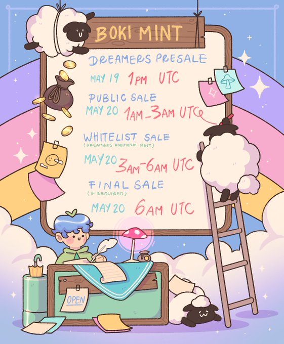 We have an important announcement: our mint day is almost here! The Boki mint will begin on May 19 at 1 pm UTC. Check out our updated schedule in the below mint map. Our Mint Website will be announced on our Twitter and Discord prior on Mint Day.