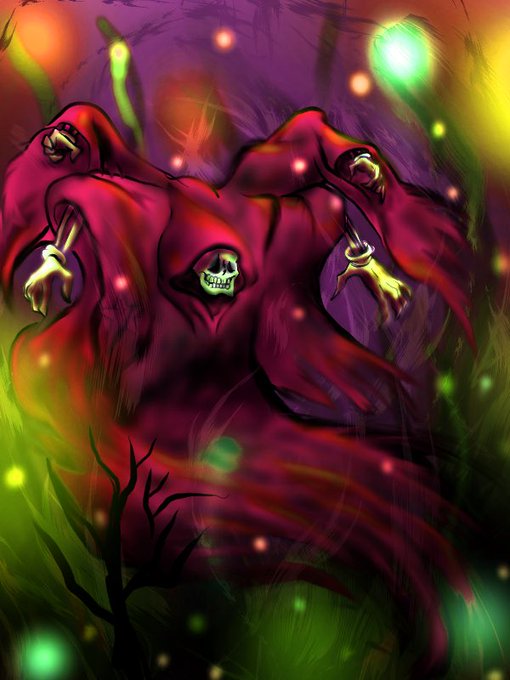 #オリジナル #怪奇生物 #過去絵 2対腕の死神さん(^ω^) あの世に行く魂を見守っています。 生霊が迷い込んだらわしづかみにして生き物に投げ戻します。 ここまでいうと聞こえはいいけど、いかんせんお顔が怖いですなぁ_(:3」z)_ (モーメント用に再投稿)