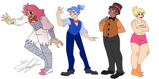 As a little project i’ve been designing the FNAF animatronics as humans! Here’s the og gang + the toy animatronics! #fnaf #fnaffanart #FiveNightsAtFreddys #fanart #artistsontwitter