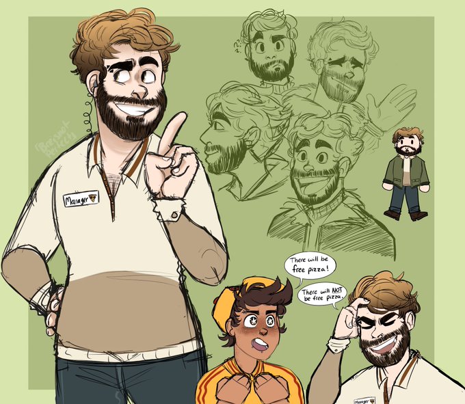 Doodle page of my boy Bear 🥺 He’s the manager of the pizza place Gavin works at.