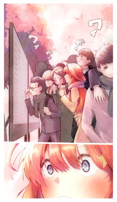 合格報告、変なテンションで喜ぶ周囲(1/2) なかなか新生活!というムードではないけど明るくやってきたいですね 落ちたひとは…一旦豪遊しよう… #五等分の花嫁