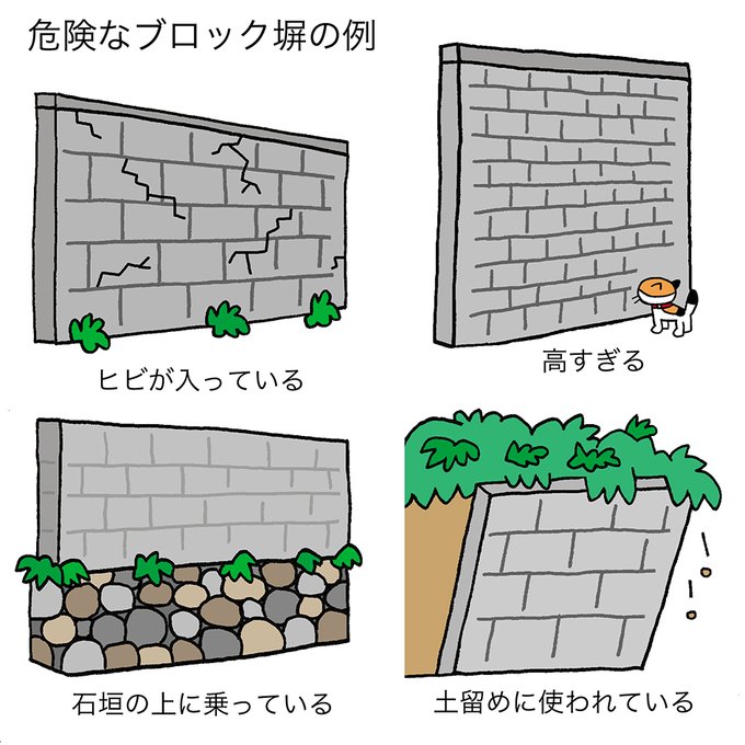 明日(6/18)は2018年の大阪府北部地震のあった日ですね。あのときはブロック塀が倒れて犠牲になったお子さんのニュースがあり、非常に胸が痛みました。危険なブロック塀の撤去に補助金を出すような対策も少しは進んでいるようですが、まだたくさんの危ないブロック塀があります。気をつけたいですね。