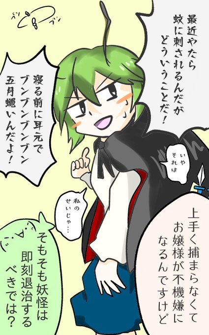 蚊は夏の風物詩。 今日のお題だったので、咲夜さんと早苗さんもいます #深夜の真剣お絵描き60分一本勝負 #リグル・ナイトバグ