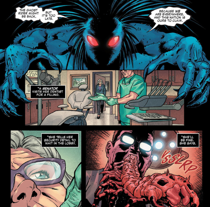 Ghost Rider (2022-) #10 読みました…チェーンソーをぶん回して悪魔達を倒すゴーストライダー、役職ある人々を乗っ取って蔓延る悪魔ブラックハート… ブラックハート「ゴーストライダーが戻ってこようとも、もう手遅れだ。この国は既に我々の物だ」