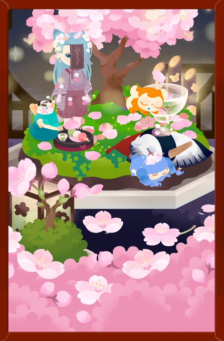 夜桜🌸 桜吹雪がひらひらキレイ お花見にはしゃいでたリヴ達はもう眠いみたい💤 #リヴリー #うちのリヴリー