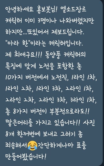 세상에 이 장르는 진짜 한번 땋으면 안푸는 효자 장르였군요. 흑발금안? 등안? 어쨌든 다 예쁘고 귀엽네요. 표를 만들어서 주셨어요. 정말 감사합니다! 땋은 머리가 각각 다 신박하게 달라서 좋네요. 제보 감사합니다!