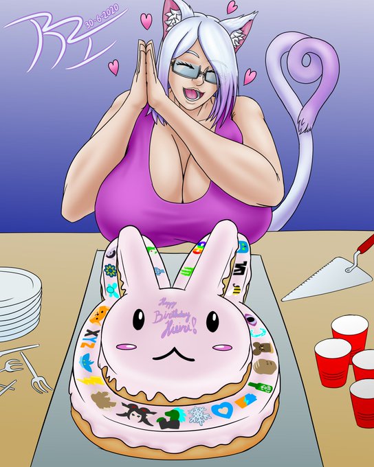 Whew, almost all the uni stuff has been dealt with! Just in time to make this little B-day comm for the big kitty friend @HieiriS! She's about to dig into the big cake of little friends! Happy birthday! 👁️🎉💜🎂