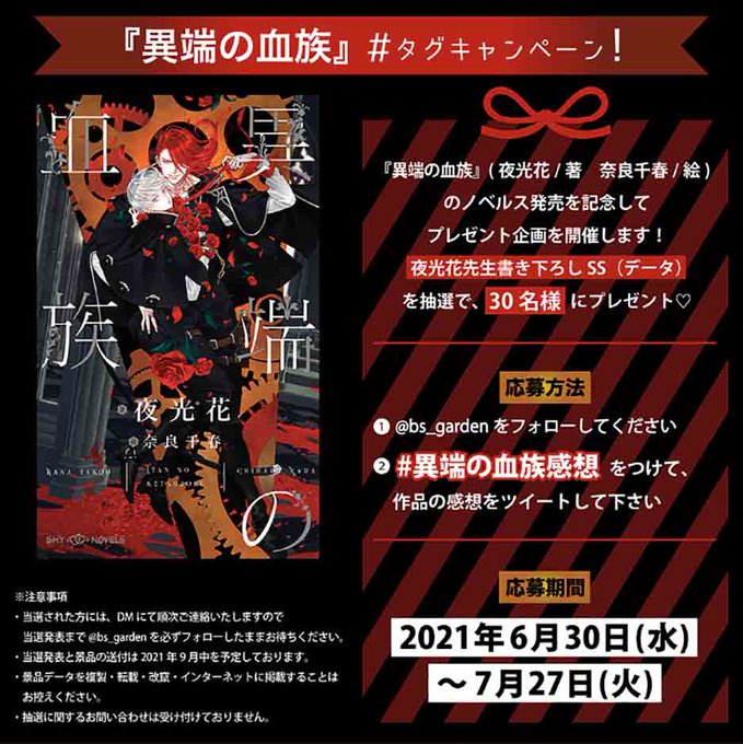#異端の血族感想 をつけて作品の感想をツイートくださった方から、夜光花先生書き下ろしSS(データ)を抽選で30名様にプレゼント🎁明日、最終日です!