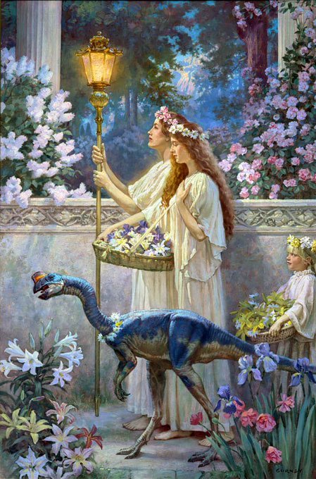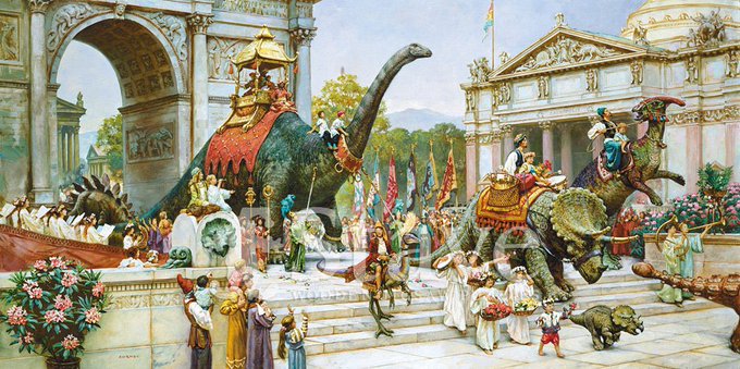#恐竜の日 なので『ダイノトピア』を推す。例えば、恐竜(オヴィラプトル!)の保育士さんが子どもを預かり、三本足の足跡を組み合わせた独自の文字文化を人間が学ぶ。恐竜と人間が、協力し、共存し、補い合って、生きている。そしてジェームス・ガーニーのこの美しい挿絵。再販が望まれます。
