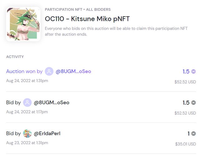 OC110 - Kitsune Miko @formfunction got bid and won by 8UGM...oSeo (can't find twitter account) in last 12 minutes. And thanks a lot to @_EARL_the_pEARL for participation in auction 🥰 don't forget to claim your pNFT.