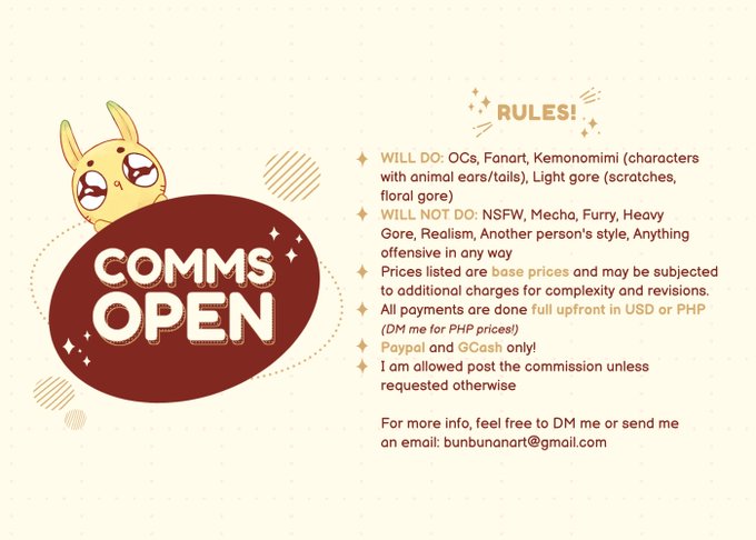 For more info, feel free to dm/email me at bunbunanart@gmail.com