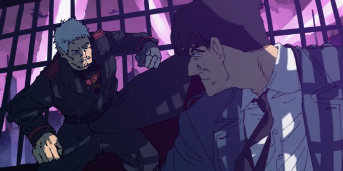 うめやさんとキャラクターのコラボ絵を描くという前代未聞のチャレンジです。うめやさんのドンカクディールさんと、自分の方から品川さんを描きました。戦闘シーンのイメージです。
