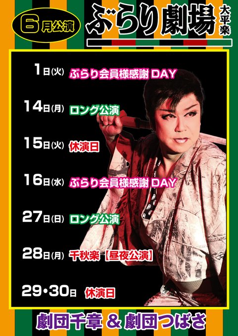6月公演 劇団千章 スケジュール 劇団つばさ様をむかえての公演となっています。大平楽初乗り劇団です‼️