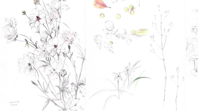 和紙を支持体に、岩絵具やパステル、水彩色鉛筆なども織り交ぜ自由なスタイルで植物を描いています。制作の際には必ず入念にスケッチをし、それを元に構成を練ります。写真はなるべく参考にせず、自分の目で見た植物の姿と、それを取り巻く空気を思い出して、大切に描いています。