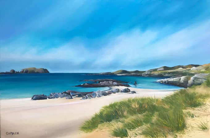 A little oil on linen board painting of #BostaBeach in the #OuterHebrides, hands down one of the most beautiful places I’ve ever been.