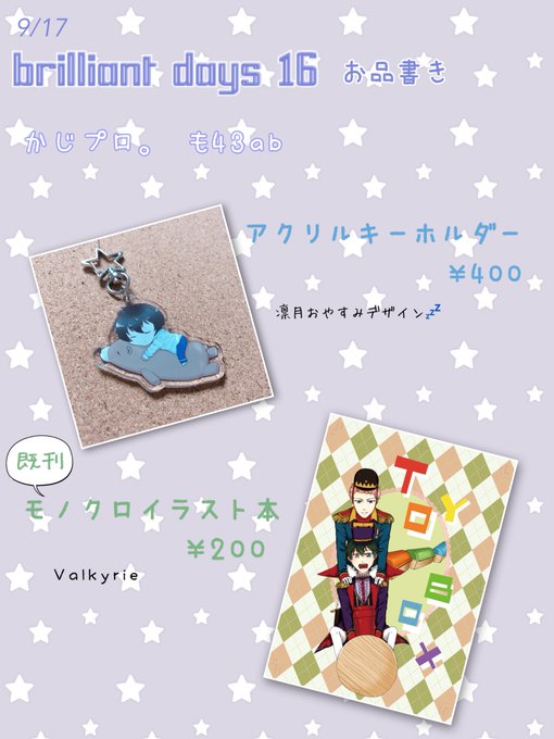 【9/17 brilliant days 16 お品書き】 かじプロ。 東6 も43ab *ぬい服(ようちえんセット、かぼちゃパンツ) *アクキー(おやすみ凛月) *既刊 モノクロイラスト本(Valkyrie) 当日はよろしくお願い致します!!! ぬい服に持ち込み数は未定です…私の頑張り次第… #あんスタ手芸部