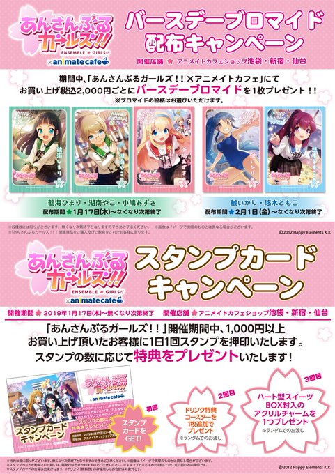 本日 2019/01/17 より、あんさんぶるガールズ!!とアニメイトカフェのコラボが開催となります!💁♀️✖️☕