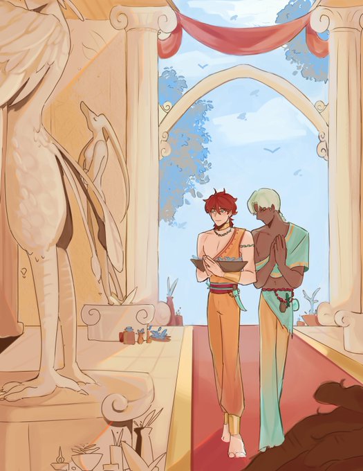 loard prolly my biggest piece yet,, tried to do a bit more for the background art 😱 sculptures of their deities- [oc] and a sketch