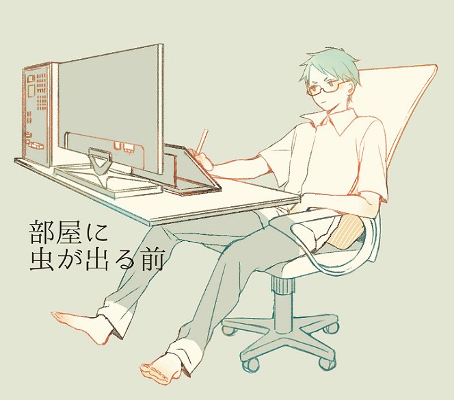 しのとさん(@tnonis69)の漫画『顧問など!』より郡山くんと松本先生~!金魚すくいが得意らしい郡山くん向け金魚背景。描いてて楽しかったけどふたりとも恐ろしく似なかった!