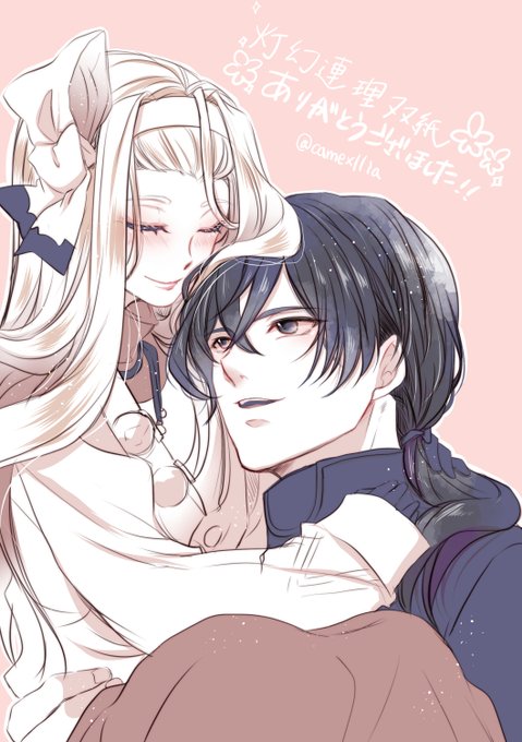 @nukitanuki3 遅くなってしまいましたがよろしければお祝いに受け取ってください!(ぬいぐるみサイズになったスルト君に戸惑うオフェちゃんという謎シチュのスルオフェちゃんです)