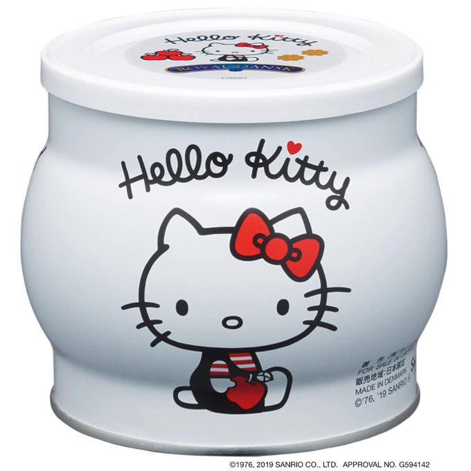 ハローキティ誕生45周年を記念して、デンマーク王室御用達ブランドを持つKelsen社のROYAL DANSKとコラボクッキーが日本限定で発売😍 キティちゃん🎀の好きな「ママの作ったアップルパイ」味のクッキーが入ったオリジナルデザイン缶 #ハローキティ