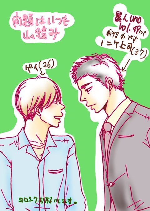 宣伝を。麗人uno!さんvol,49にて32p描かせてもらってます。おじさんがホホ染める度合いの高いお話、よろしければお願いします!