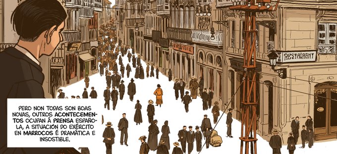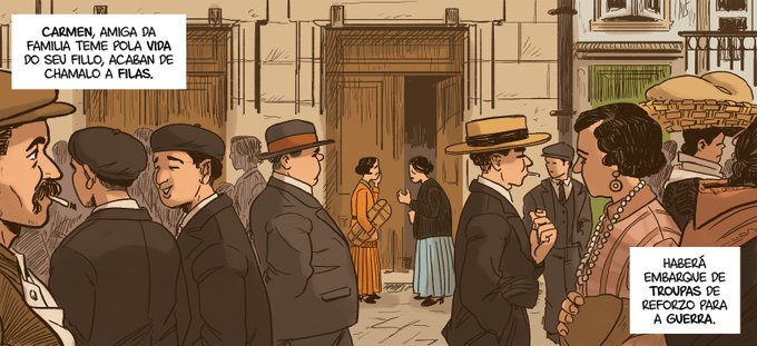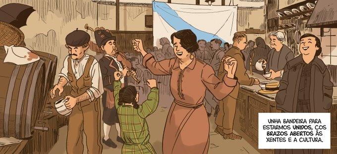 Estas son algunhas das viñetas do cómic guionizado por Manel Cráneo que debuxei para a mostra ”1921-2021. 100 anos da bandeira galega no Palacio Municipal da Coruña".