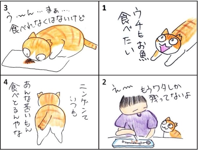 カニカマ以外、ニンゲンの食べ物に手を出さなかったハナ。ためしにもらってもたらすごく苦かったよ。ま、サンマのワタだからね。