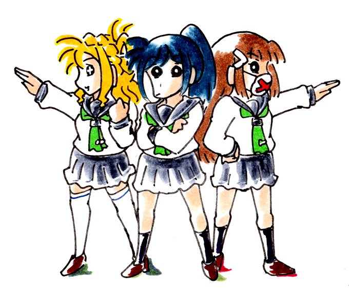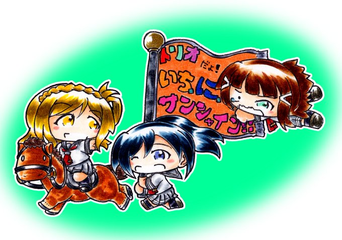 「素潜り果南」 「堅物ダイヤ!」 「おかねもちマリー!」 「「「三人合わせて、内浦青カエル隊!!」」」 #lovelive 「……って何コレ?」 「Oh~it's パロディ〜」 「なんでワタクシまでこんなこと……」