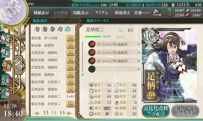 足柄さんを改二にしました、装備は20.3cm(2)号砲を3つでした!電探を1つくらい持ってくるかと思ってましたが、まさかの電探なしでした(笑)