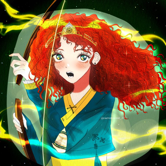 계속해서 결혼하라는 엄마 '엘리노어'에 맞서서 자신만의 삶을 살기원하는 공주 '메리다'를 그려봤습니다! 메리다가 들고있는 활은 엘리노어가 부순, 메리다가 어릴때 아버지께 선물받은 활이랍니다...😳❤❤💖