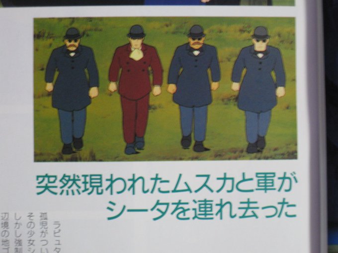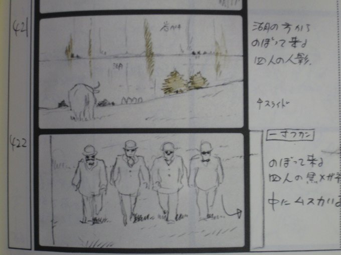 シータがムスカと黒眼鏡がゴンドアに来た時のことを回想するシーンで、絵コンテにはあったムスカと黒眼鏡が近づいて来るカット(Cut No.422)が本編では削除されています。しかし、セル画まで制作されているようで、ラピュタのガイドブックにそのカットが掲載されています(画像3)。#天空の城ラピュタ